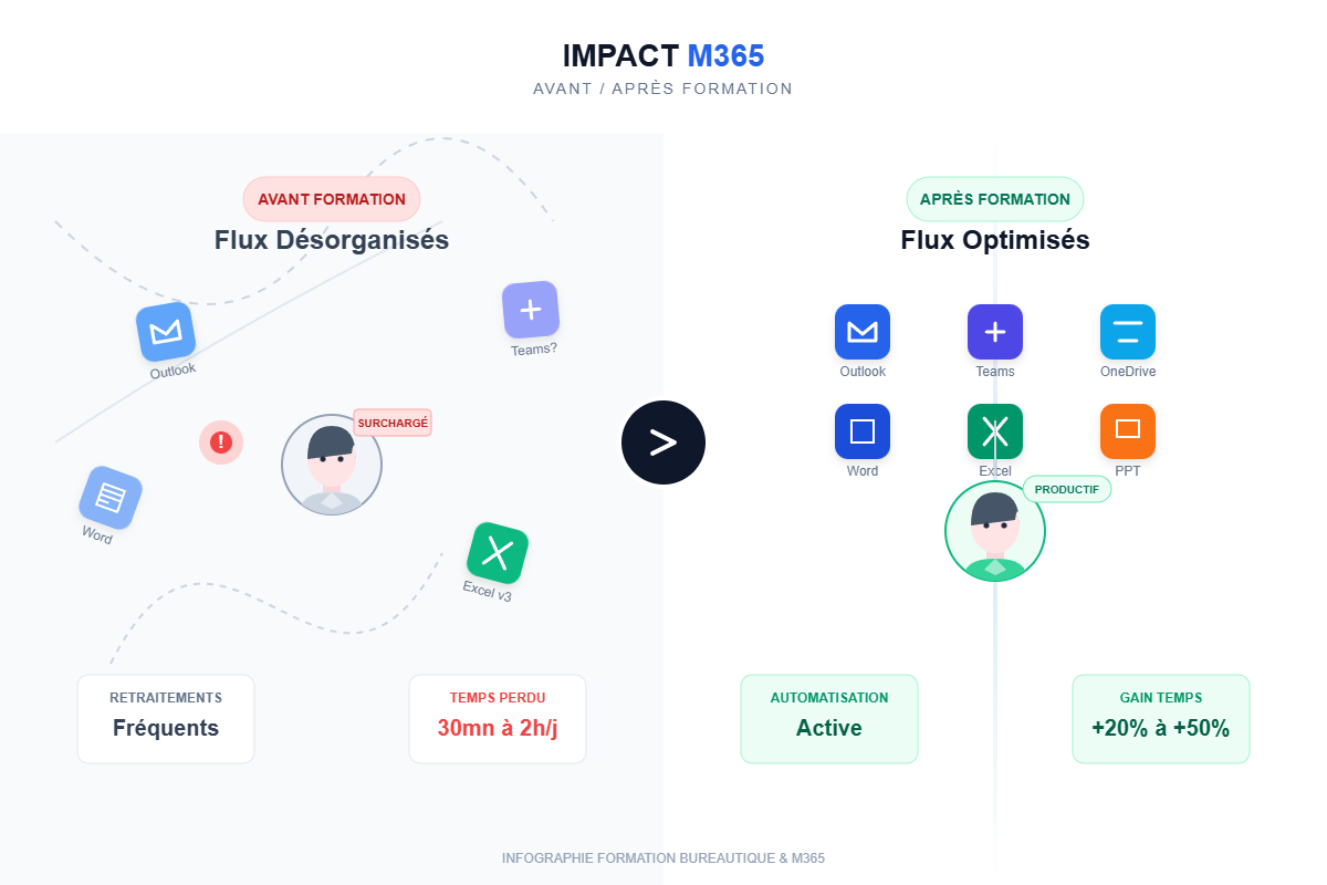 Des formations professionnelles 100 % adaptées à vos processus, vos fichiers et vos équipes, pour transformer vos outils bureautiques en leviers de performance opérationnelle.